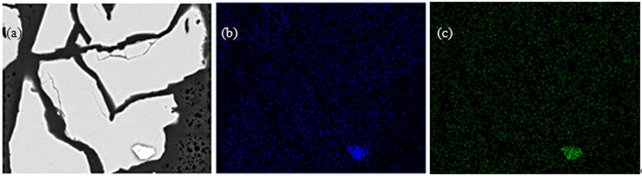 图2 某脉石英热压浸出后(a)石英颗粒剖面形貌图,(b) (c)分别为SEM-EDS对石英颗粒剖面杂质金属元素Al和Mg能谱面分布分析