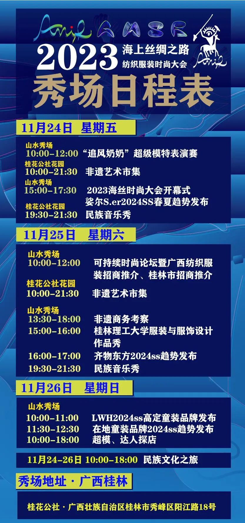 本次大会将充分结合桂林的旅游特色和潜力,以广西非遗文化为基础,通过纺织服装产业的载体,以推动在地经济生态为发展目标,开展产业研讨、招商推介、趋势探讨、赛事活动、民族文化之旅的五大板块。届时,现场活动将丰富多样,包括可持续时尚论坛、2024春夏民族时尚主题大秀、国潮童装品牌发布、海丝时尚“追风奶奶”超级模特表演赛总决赛以及民族文化之旅。其中,论坛旨在推动广西纺织时尚产业的非遗创新与文化产业发展,推动民族时尚产业的发展,为民族潮流,国潮流行的时尚消费和投资提供巨大商机,从而拉动内需,激活时尚消费潜能。