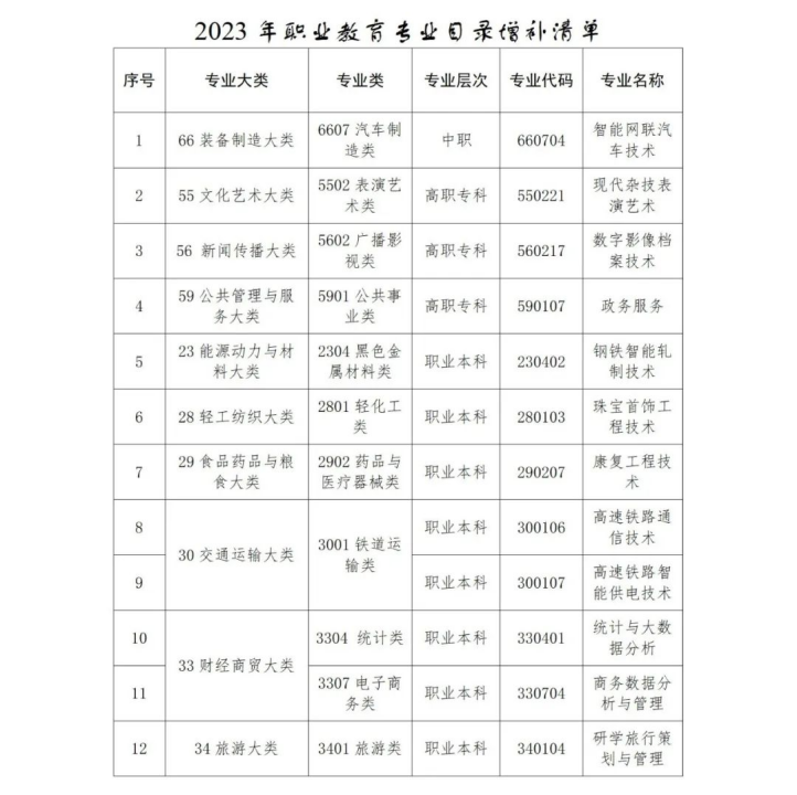 教育部公布2023年职业教育专业目录增补清单,包括中职、高职、职业本科的10个大类、12门专业。“智能”是清单中的高频词,比如,中职专业增补了“装备制造大类”的智能网联汽车技术专业,职业本科专业增补了“能源动力与材料大类”的钢铁智能轧制技术专业、“交通运输大类”的高速铁路智能供电技术专业。还有一些传统专业有了新概念,例如“交通运输大类”增加了高速铁路通信技术专业,“财经商贸大类”增加了统计与大数据分析专业等。