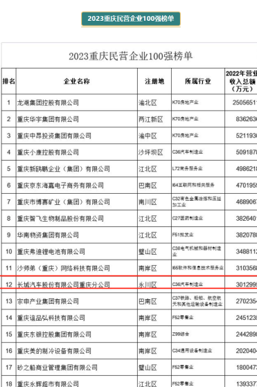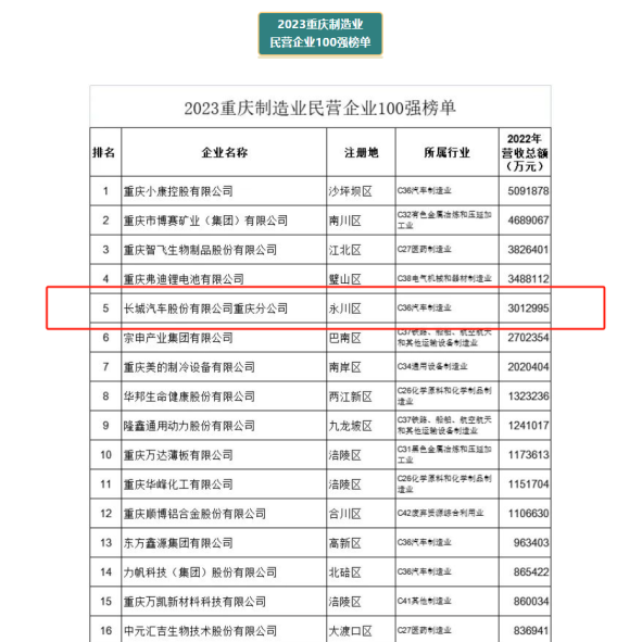 永联园区商会副会长单位长城汽车股份有限公司重庆分公司分别上榜民营企业100强(12)、制造业民营企业100强(5)两大榜单,再次表示热烈祝贺,期待明年商会更多的企业上榜,展现在永经商的民营企业精神!