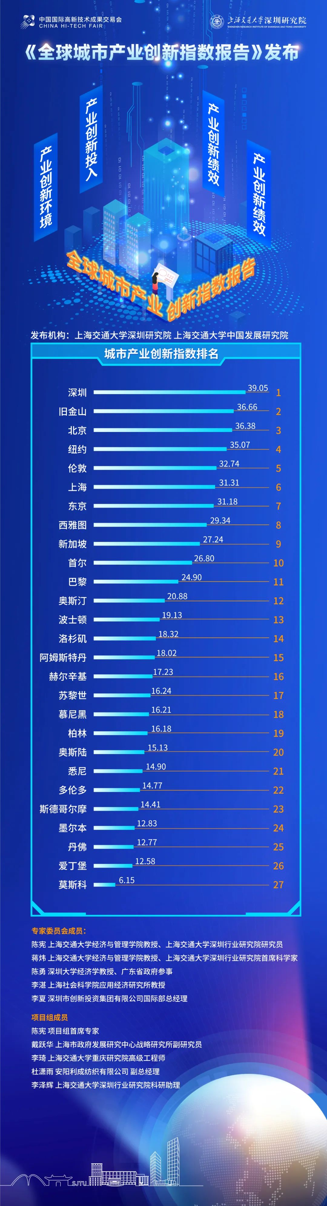 2023年11月17日,由上海交通大学主办,交大深圳行业研究院承办的第二十五届中国国际高新技术成果交易会系列活动之一:《全球城市产业创新指数报告》发布会暨深圳产业科技创新论坛上,《全球城市产业创新指数报告》正式发布,该指数由上海交通大学深圳行业研究院与中国发展研究院联合编写,课题组根据城市是否具有产业引领能力、经济规模优势、创新策源功能、辐射影响效能等四个标准,在全球范围选择了27座城市,并从产业创新环境、投入、产出、绩效四个维度设计指标体系,对入选城市进行综合评价,加权计算出每个城市的产业创新指数。