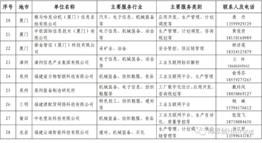 》,根据《福建省工业和信息化厅关于组织开展产业数字化服务商(第一批)申报工作的通知》(闽工信函信息〔2023〕329号)要求,经企业申报、地市推荐、专家评审、网上公示等,确定中国移动通信集团福建有限公司等28家企业为福建省产业数字化服务商,现予以公布。