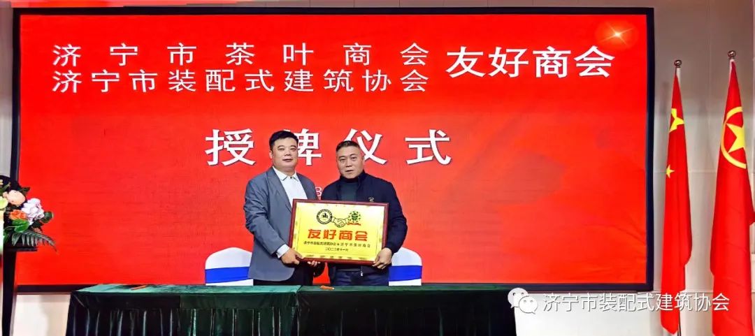 在签约仪式上,济宁市装配式建筑协会会长王长留与济宁市安徽商会会长程辉、济宁市江苏商会会长渠永、济宁市茶叶商会会长江波、济宁市儒商太极拳协会会长王汉卫等商会代表分别进行了友好商会签约和授牌仪式。