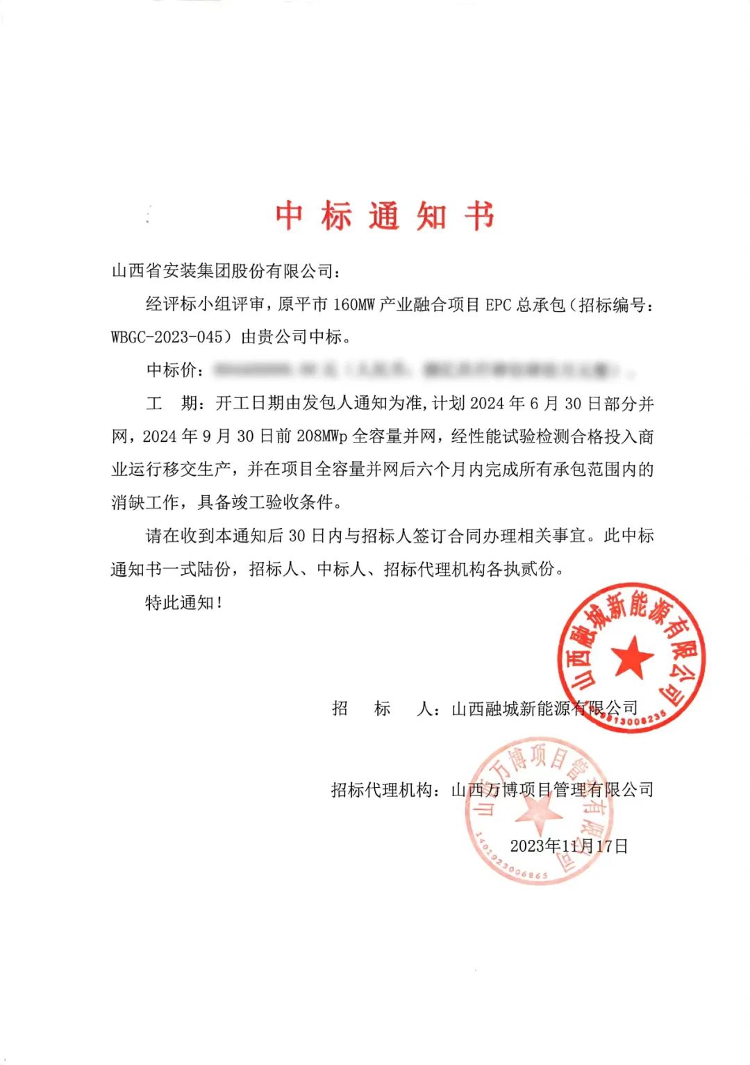 喜报迭递,佳音频传。近日,山西建投安装集团中标原平市160MW产业融合项目EPC总承包。