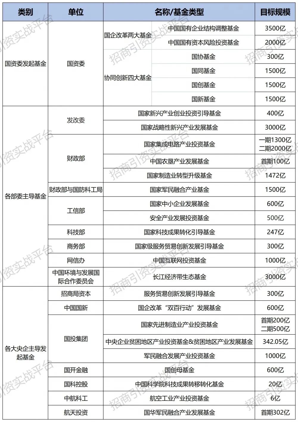 国家级政府引导基金主要由国家部级单位或者央企发起,主要分为三类:一是国资委发起基金;二是各部委主导基金;三是各央企主导发起基金。