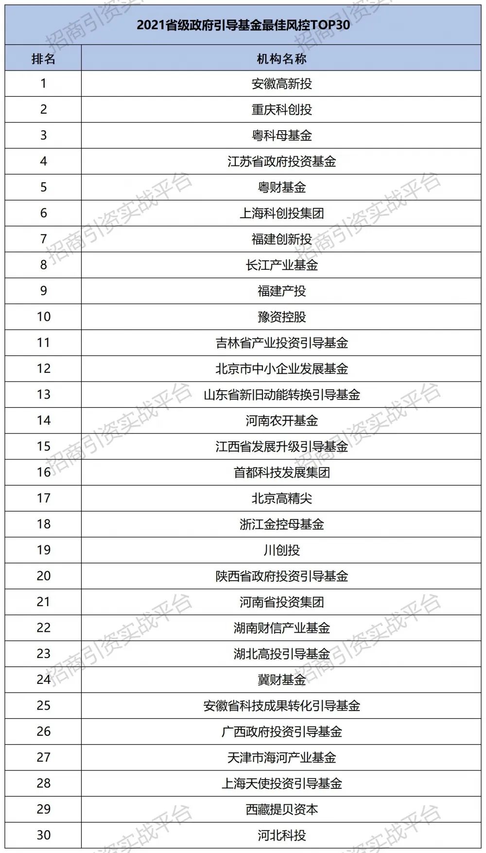 根据母基金研究中心发布的榜单显示,省级政府产业引导基金中,安徽高新投、重庆科创投、粤科母基金、江苏省政府投资基金等机构进入榜单前30。如下: