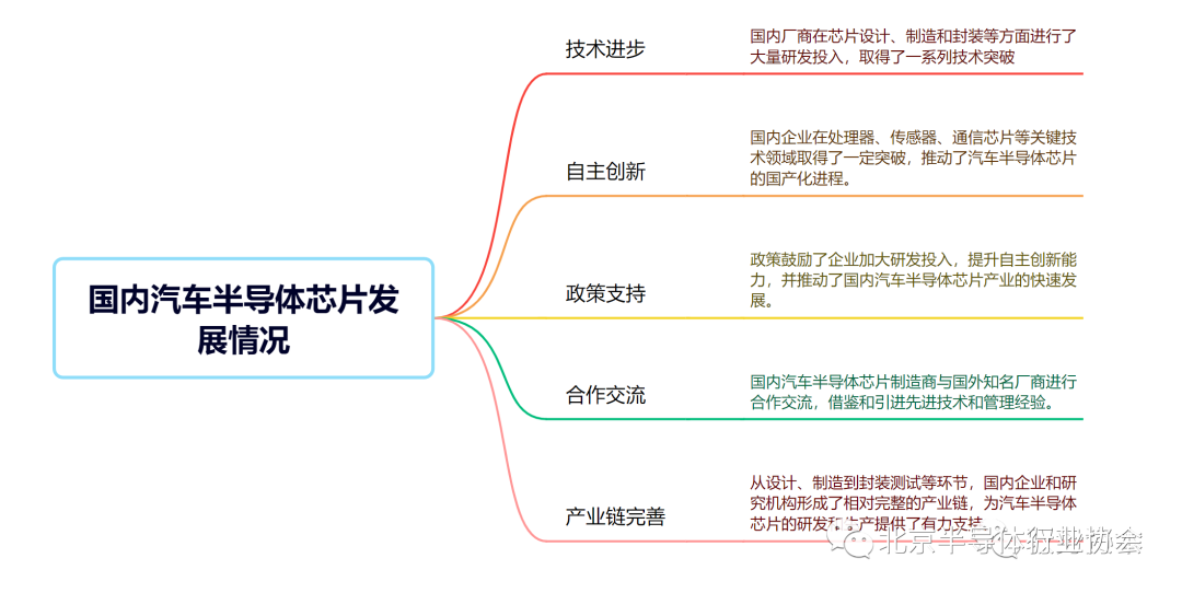 总体来说,国内汽车半导体芯片的发展取得了显著进展。国内制造商在技术水平、自主创新、政策支持、合作交流和产业链等方面取得了积极成果。然而,仍需加大研发投入,提升技术水平和产品质量,加强与国外厂商的合作,进一步推动国内汽车半导体芯片产业的发展。