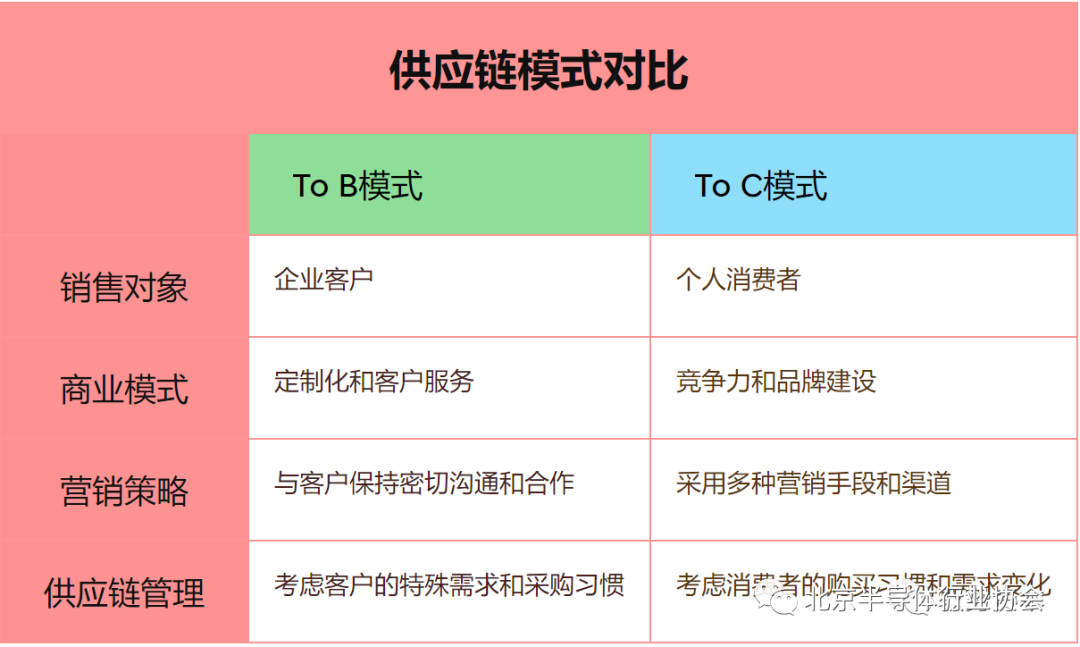 4. 供应链管理不同:To B模型需要考虑客户的特殊需求和采购习惯,而To C模型需要考虑消费者的购买习惯和需求变化。