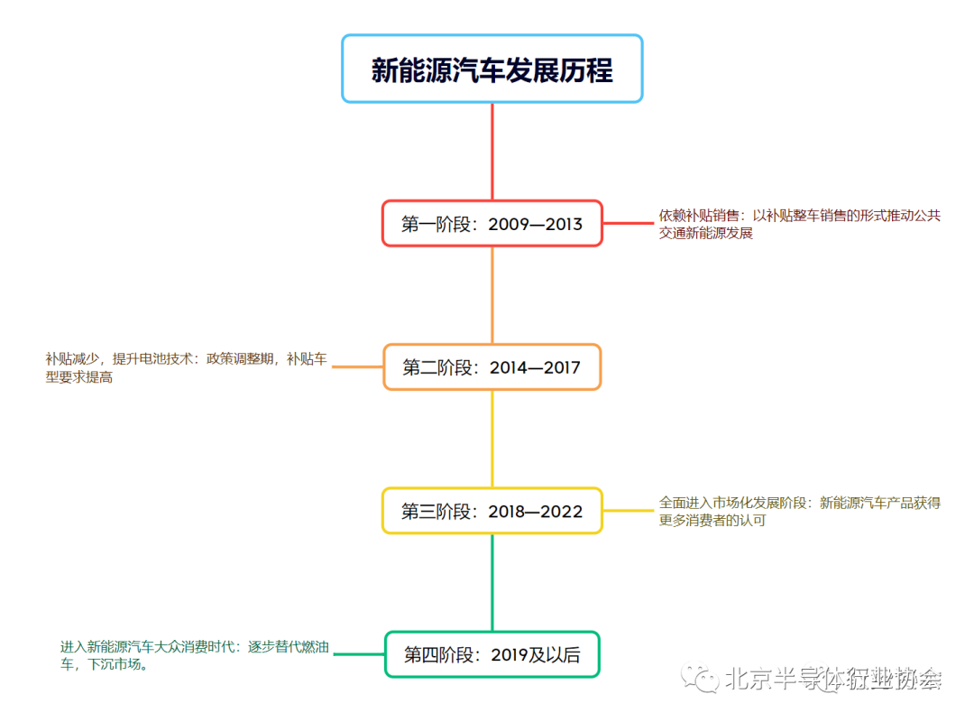 长期以来,汽车产业发展在中国GDP增长中占有重大比重。尤其是近年来中国经济转型阶段,新能源汽车的消费增量不容忽视。自2009年以来,中国新能源汽车行业发展迅猛,可划分为以下四大阶段: