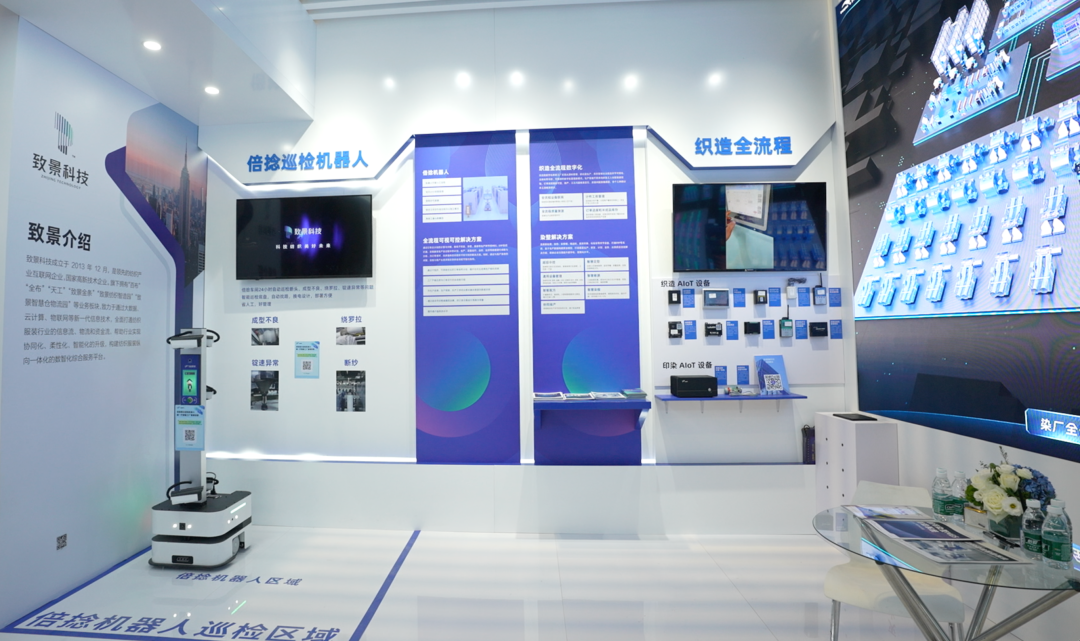 本次展会,致景科技带来的新一代智能工厂基础设施——“边织边检”机器人,通过高清摄像头模组实时监测布面,以智能巡检替代人工巡检,实现织造环节0巡检,并通过实时智能巡检、事中质检预警、事后报告输出等模式,实现生产信息的全流程可视化,助力纺织生产迈向智能制造。当前“边织边检”系统识别准确率达90%以上,提高挡车工50%工作效率,节省30%的验布工。应用在梭织面料生产领域的智能“倍捻巡检机器人”可实现倍捻机24小时自动巡检,每班巡检达16次以上,节省50%的倍捻看台工,达到即省人又不增加质量问题的效果,进一步提升产品质量及稳定性。
