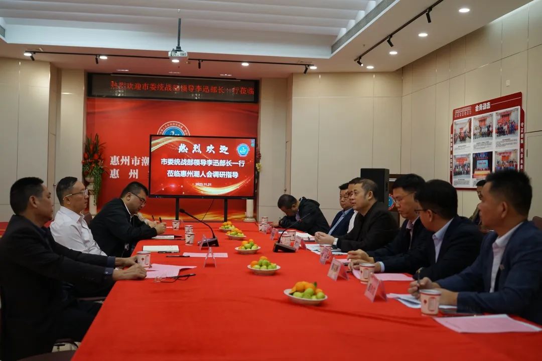 11月21日上午,惠州市市委统战部副部长、市侨务局局长、二级巡视员李迅,非公经济工作科科长林吉祥、 非公经济科干部徐良满、非公经济科干部潘思凡一行到我会调研指导工作。我会会长姚文专,常务副会长郑炜、李伟明,副会长张鸿发、蔡奕辉、苏妙龙等热情接待并参加调研座谈会。