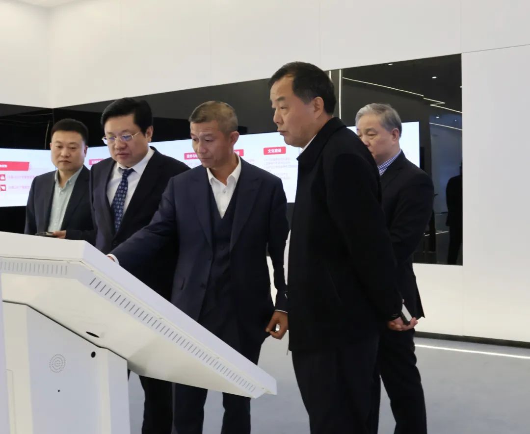 在公司自主开发、设计、建设的数字共享展厅内,祝斌会长一行参观了“金华市江苏商会主题馆”,全景了解了金华市江苏商会的建设成果。随后,通过一键切换功能,数字共享展厅立即变身“中谷智业主题馆”,展示了会长单位中谷智业的发展历程、园区运营管理经验、共赢模式和数字化转型成效等。