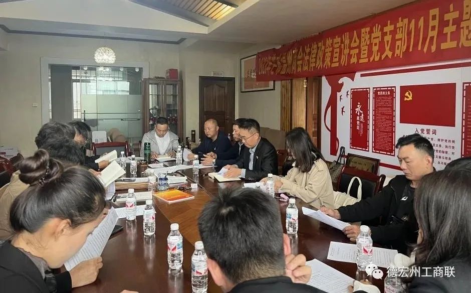 为深入学习贯彻习近平新时代中国特色社会主义思想,推动主题教育走深走实,切实提高民营经济人士的法律意识,助推法治化营商环境优化提升。近日,芒市温州商会组织召开法律政策宣讲暨党支部11月主题党日活动。芒市工商联党组成员、秘书长方岩放保、芒市工商联(总商会)法律顾问、云南众济律师事务所康素纯律师、温州商会党支部全体党员、芒市温州商会领导班子参加了会议。