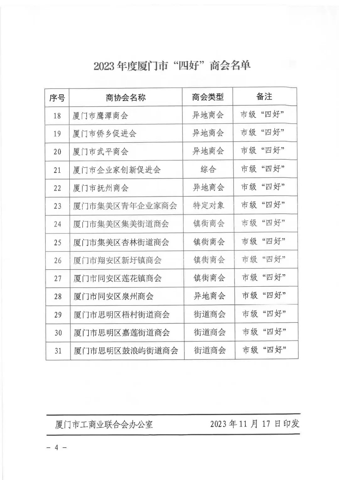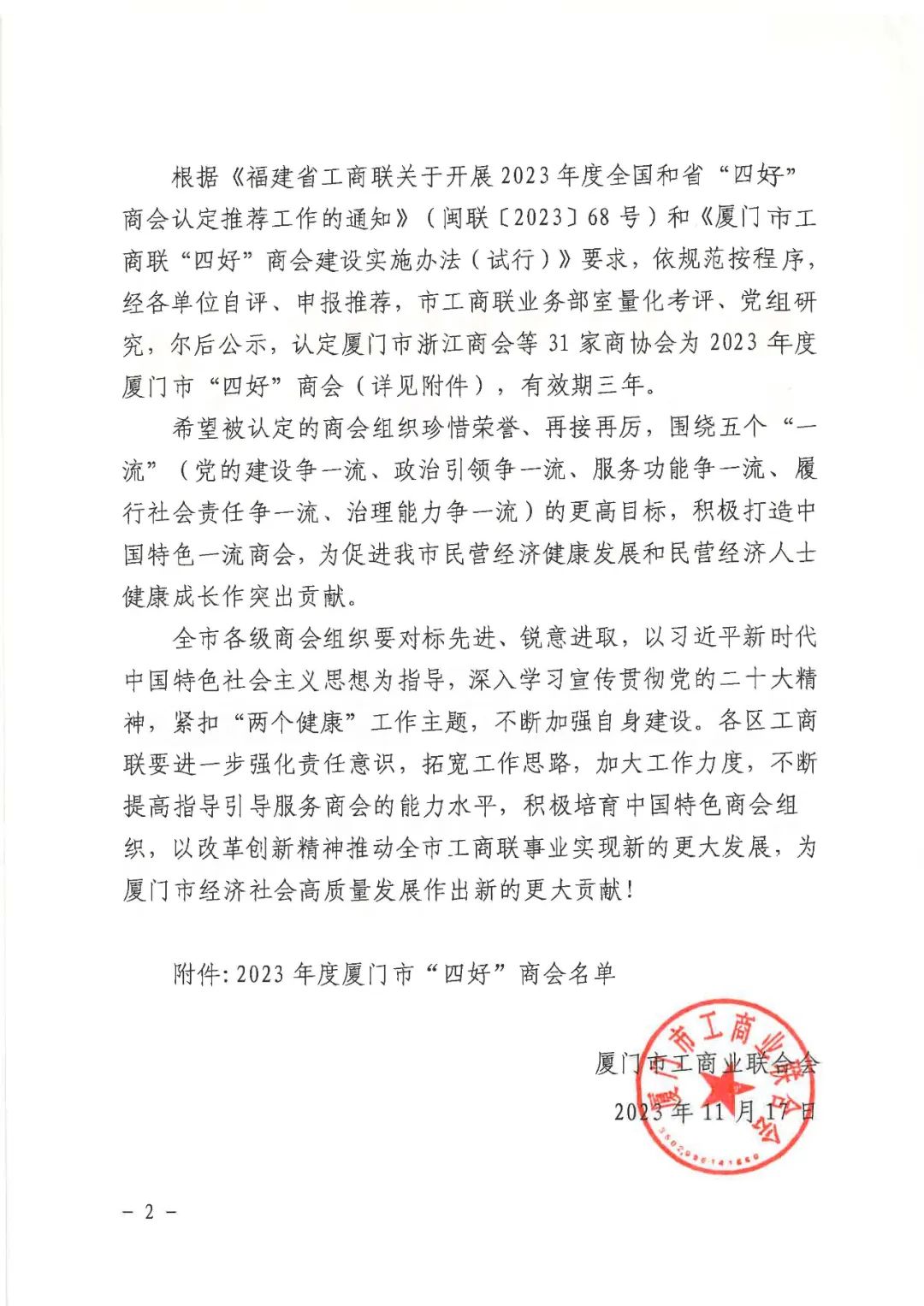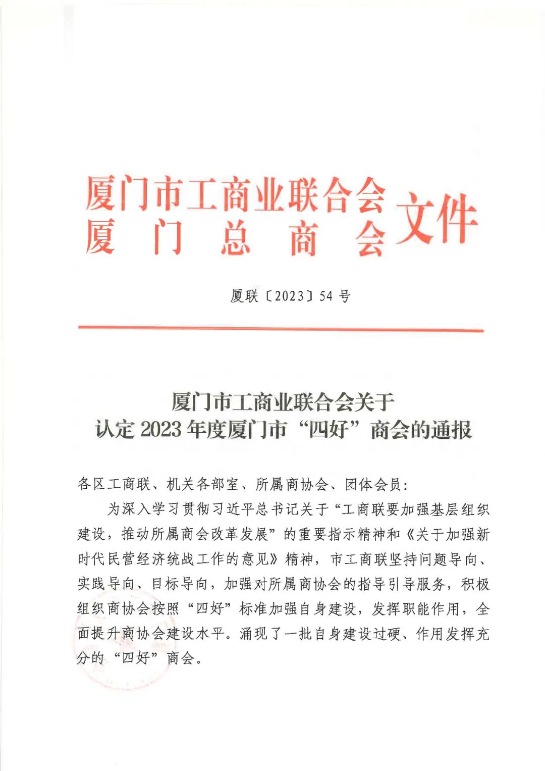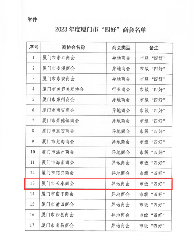 近日,厦门市工商联(总商会)发布《厦门市工商联(总商会)关于认定2023年度厦门市“四好”商会的通报》,厦门市长泰商会荣获2023年度厦门市“四好”商会荣誉称号!