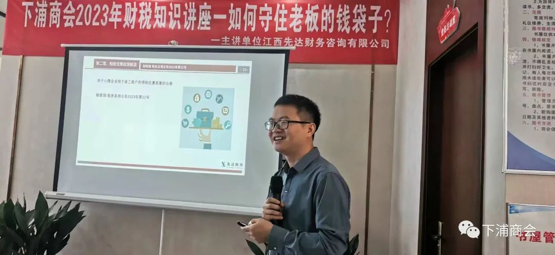 2023年11月4日下午,江西先达财务咨询有限公司为我会企业家们举办了一场以:“如何守住老板的钱袋子?”为主题的公益讲座。课题内容:经典案例及征管环境解析;23年最新优惠政策宣讲;合理公转私方式;公转私存在的风险。