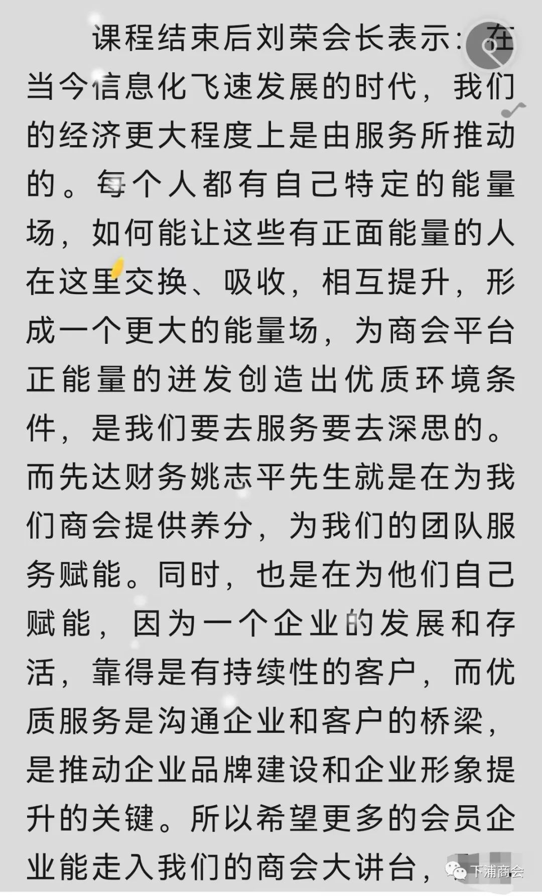 是的,一个企业的发展和存活,靠的是有持续性的客户,而优质服务是沟通企业和客户的桥梁,是推动企业品牌建设和企业形象提升的关键。先达财务在服务这块确实做得非常好,所以希望更多的会员企业能走入我们的商会大讲台,聚力共生,赋能共赢!为社会发展做出贡献!