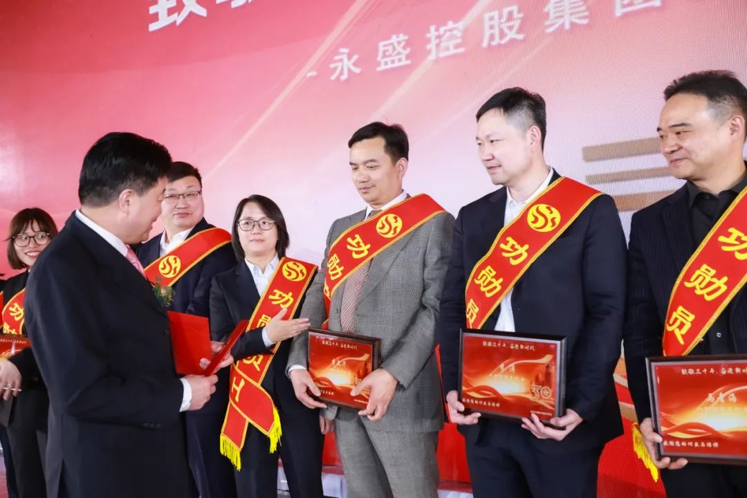 集团总经理李健浩出席,并与出席大会的嘉宾一道参加了庆典启动仪式。大会还特别邀请出席领导为永盛20年及以上工龄的功勋员工进行了颁奖!