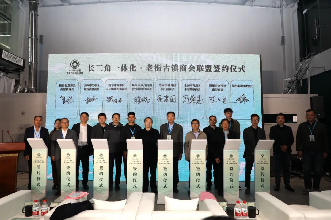现场,长三角一体化•老街古镇联盟会员扩充签约仪式举行。上海市青浦区朱家角镇商会、南京市秦淮区夫子庙步行街商会、浙江省嘉善县西塘镇商会、湖州市南浔区南浔商会、苏州市吴中区甪直镇总商会、苏州市姑苏区平江路商会、扬州市文昌商圈(汶河街道)商会及杭州市茶楼业协会共同签约,一致同意将在此次活动结束后,高质量地、有序地吸收和扩大其他老街和商会加入“长三角一体化•老街古镇商会联盟”,团结协同发挥老街古镇商会联盟的作用,推进老街古镇在长三角一体化发展中取得更大成效。