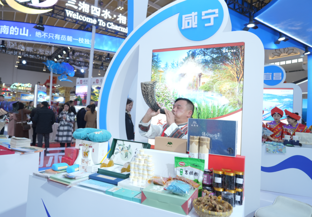 “温泉之城,桂香咸宁,瑶望千年,只为等您,欢迎大家来咸宁旅游,到通城做客......”展会现场,随着药姑山古瑶村的牛角号角声响起,工作人员向参观市民和游客推介咸宁旅游资源和文旅产品,讲述咸宁故事,并向世界发出旅游邀约。