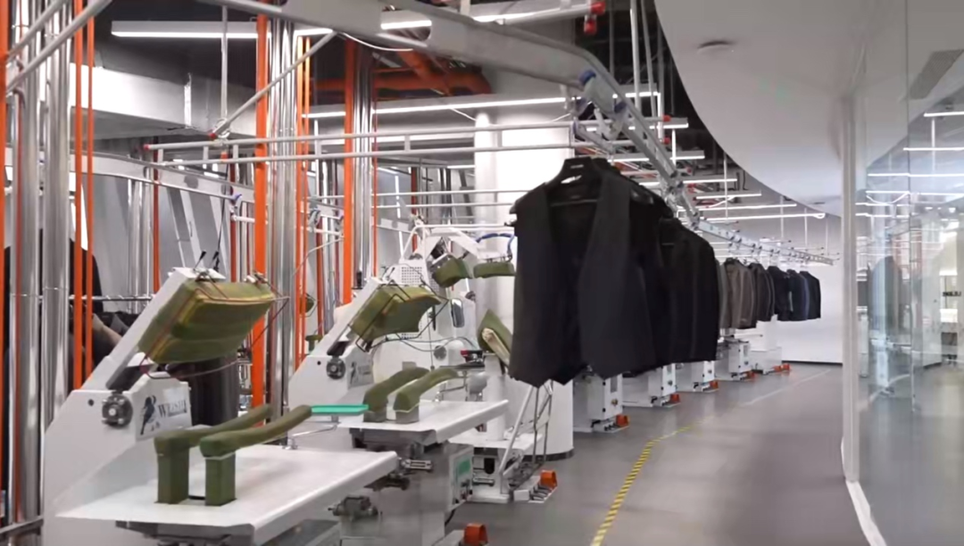 自动化裁剪、模板自动针车、U型自动化流水线、设备智能改造研究室、面料验布机等数字化设备,在利郎车间一应俱全。裁剪后的布料进入U型自动化生产线,只需1分30秒的时间,一条裤子便可缝制完成。在持续的技术推进下,不断优化面料供应,是支撑利郎“极致单品”研发的“秘诀”。数据显示,2021年,利郎采用自主研发面料的产品比例已经达到50%左右。