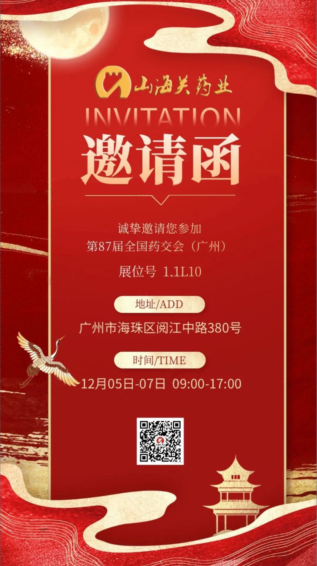 2023年12月5日-7日,中国医药行业领域历史最悠久、规模最大的品牌盛会-第87届全国药品交易会将在中国进出口商品交易会展馆(广州)隆重举行。秦皇岛市山海关药业有限责任公司作为参展企业之一,将携多款产品亮相展会!届时诚邀与您共享盛会,合作共赢!
