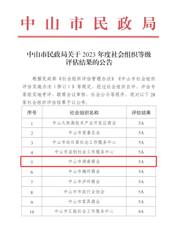 根据民政部《社会组织评估管理办法》《中山市社会组织评估实施办法(修订)》等规定,经过社会组织自评、评估专家组实地考评、联席会议审核、社会公示等程序,中山市湖南商会再次获评5A级社会组织称号!