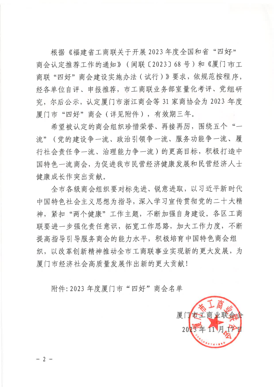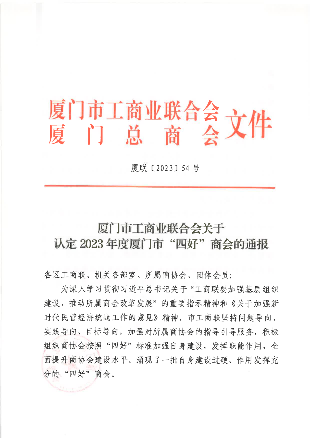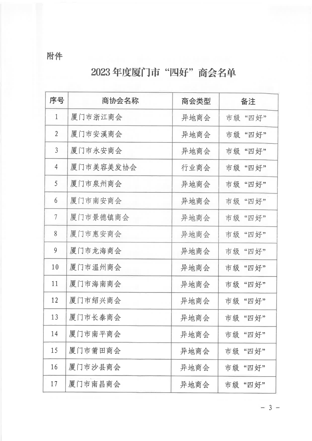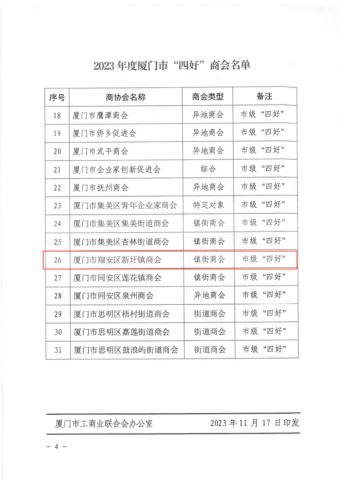 近日,厦门市工商联发布关于2023年度厦门市“四好”商会的通报,全市31家商协会被认定为2023年度厦门市“四好”商会,厦门市翔安区新圩镇商会榜上有名。
