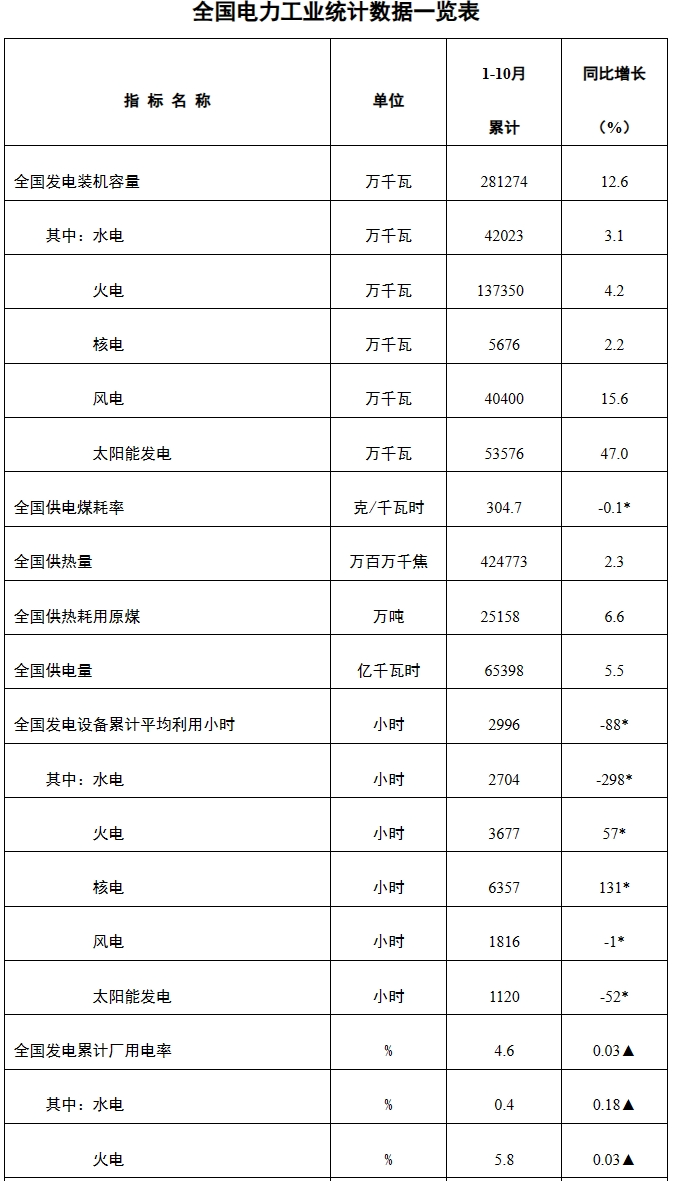 内容摘要:11月20日,国家能源局发布1-10月份全国电力工业统计数据。截至10月底,全国累计发电装机容量约28.1亿千瓦,同比增长12.6%。其中,太阳能发电装机容量约5.4亿千瓦,同比增长47.0%;风电装机容量约4.0亿千瓦,同比增长15.6%。