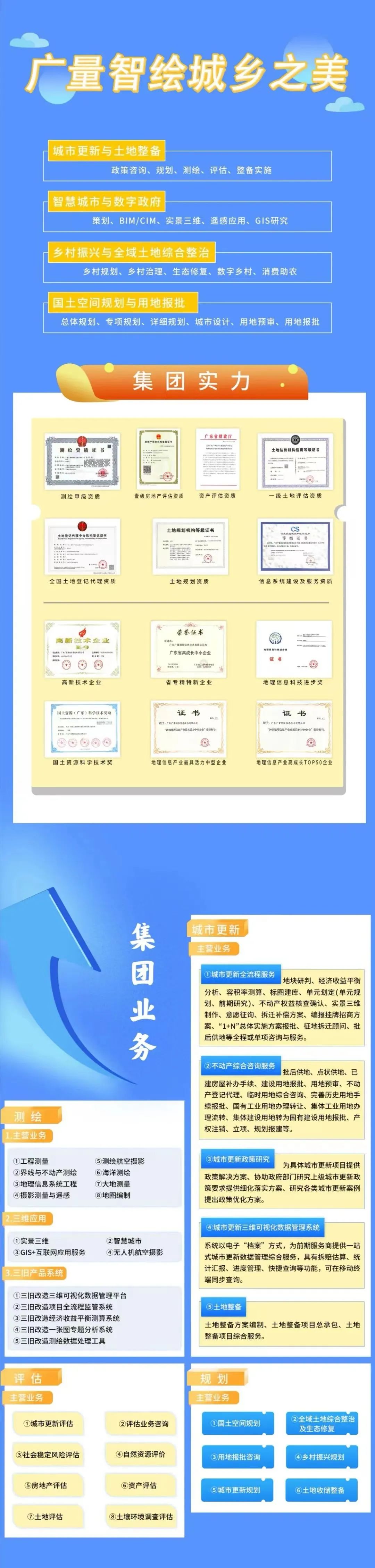 中量发展&广量集团拥有多年和丰富经验的评估、规划、测绘、古树名木保护及迁移、工程咨询管理等相关资质和专业技术团队,致力于城乡更新和产业发展全过程的各项专业资质技术服务,竭诚提供“一站式”综合解决方案的供应商。保证为客户提供“至尊、至善、至优”的服务,秉承“优质、高效、贴心”的服务宗旨,赢得了政府和社会各界的充分认可和高度评价。