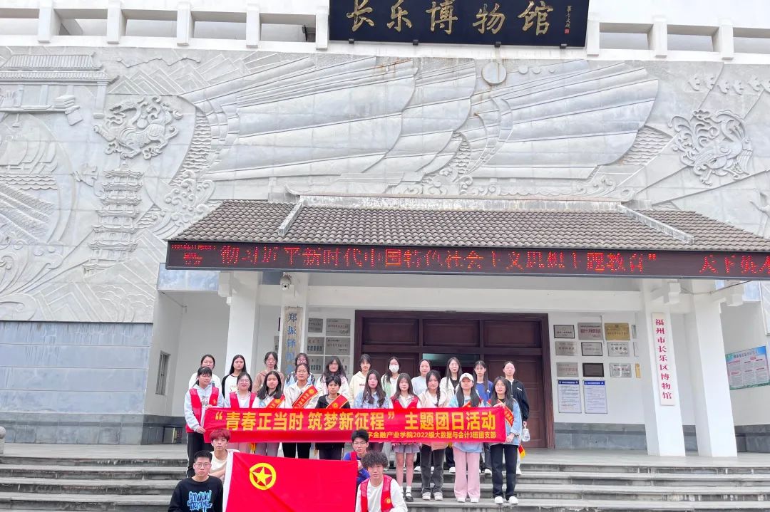 2023年11月8日,数字金融产业学院2022级大数据与会计3班团支部赴长乐博物馆开展“青春正当时 筑梦新征程”主题团日活动。团支部成员在馆内体会钟磬之声、文物之风,全面了解长乐悠久历史和在新思想引领下取得的成就,领会党的二十大精神丰富内涵。通过本次活动,同学们不断增进对党创新理论的政治认同、思想认同、理论认同和情感认同。青年一代人,生逢盛世,重任在肩,于人生定向之时,当立鸿鹄之志。