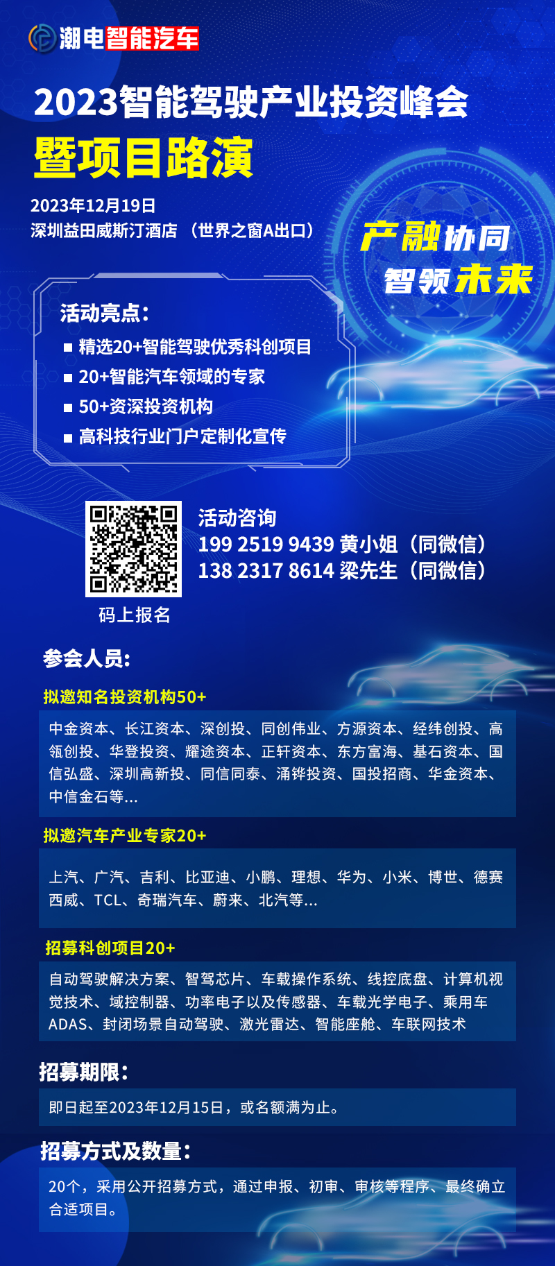 本届峰会由潮电智能汽车发起主办,旨在促进智能驾驶领域创新技术和投资交融。截至目前,主办方已邀约集中优秀科创项目20+、智能汽车资深专家20+、知名投资机构50+,共解新汽车时代的财富密码。