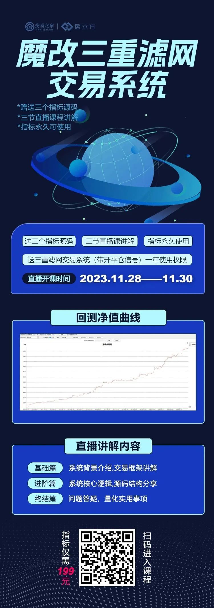 课程包含三个部分的讲解,包含直播课程和指标源码,并可进群与其他量化交易爱好者一同交流学习!