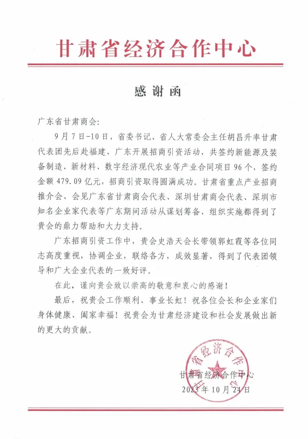 2023年10月24日,甘肃省经济合作中心对9月份在广州召开的甘肃省重点产业招商推介会协办方发来感谢函。感谢函对商会、执行单位在甘肃省委书记、省人大常委会主任胡昌升率甘肃代表团赴广东开展招商引资活动期间提供的帮助和大力支持表示了感谢,并特别指出:“广东省甘肃商会会长、秘书长及各位相关副会长高度重视,协调企业,联络各方,成效显著,得到了参会的甘肃代表团领导和广大参会企业的一致好评”。