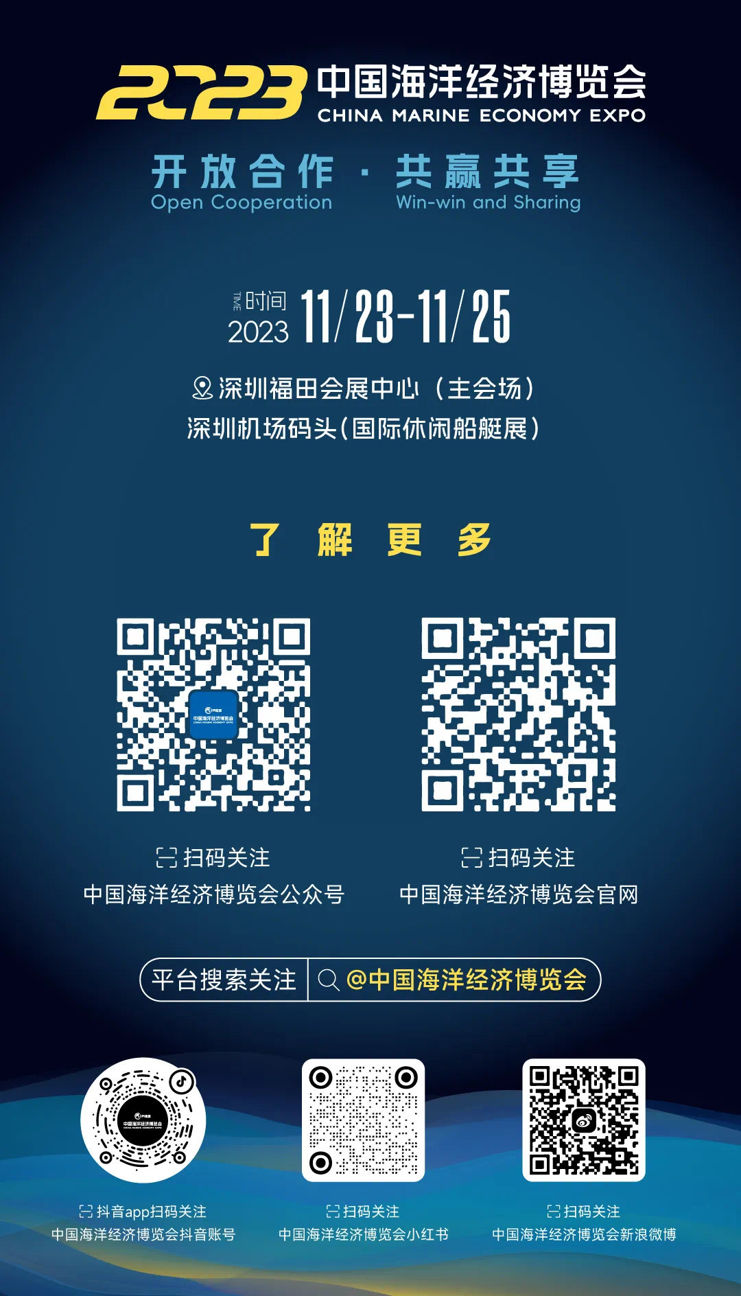 2023中国海洋经济博览会于11月23日至25日在深圳会展中心(福田)和深圳机场码头(宝安)举行,来自16个国家、地区和国际组织的嘉宾、展商齐聚深圳,通过技术交流、产品展示、成果交易、高端论坛、招商引资等一系列活动,凝聚蓝色发展共识、拓展蓝色合作空间,为海洋科技创新、海洋经济高质量发展和海洋领域国际合作带来新机遇、注入新动能。11月23日至27日,别开生面、精彩纷呈的“海洋嘉年华”深圳国际海洋周也如期登场,在全市举办逾百场精彩活动。