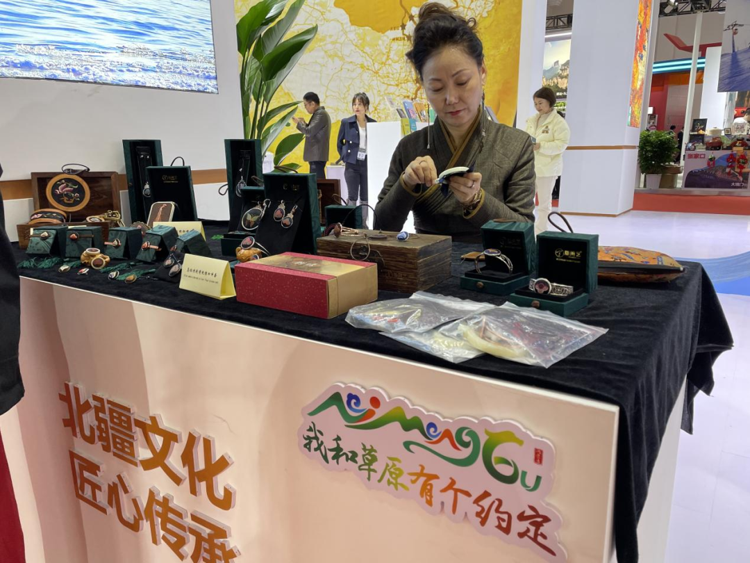 交易会期间,内蒙古展台活动丰富,精彩纷呈。非遗传承人的精湛技艺、乌兰牧骑的歌舞展示、“我和草原有个约定”系列文创产品受到了观众青睐。商务洽谈区前来对接业务洽谈的企业家,谈需求、推线路、交朋友,座无虚席、洽谈气氛热烈。背景画面展示着中俄蒙“万里茶道”旅游线路。