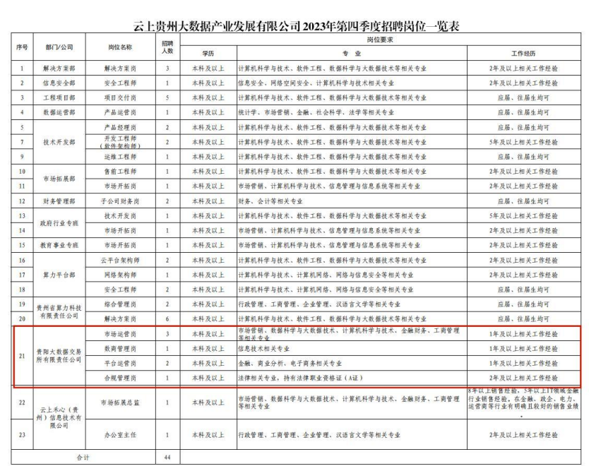 详见附件《云上贵州大数据产业发展有限公司2023年第四季度招聘岗位一览表》。