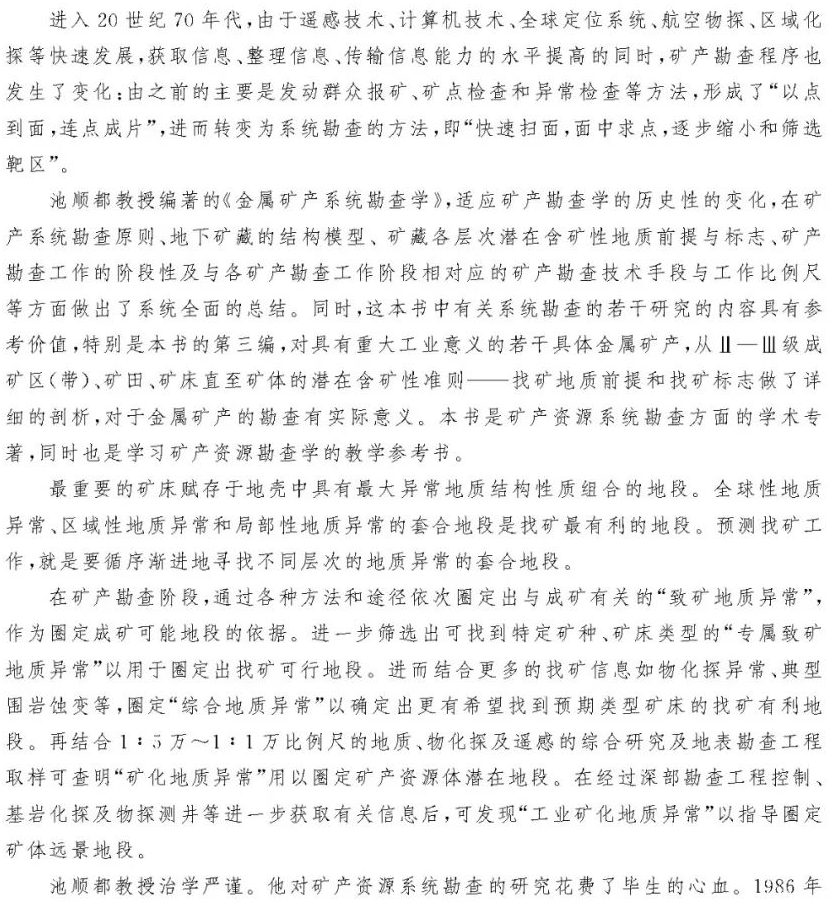 赵鹏大院士为本书作序,并对本书进行了高度评价,认为《金属矿产系统勘查学》适应矿产勘查学的历史性变化,在矿产系统勘查原则、地下矿藏的结构模型、矿藏各层次潜在含矿性地质前提与标志、矿产勘查工作的阶段性及与各矿产勘查工作阶段相对应的矿产勘查技术手段与工作比例尺等方面做出了系统全面的总结。同时,这本书中有关系统勘查的若干研究的内容具有参考价值,特别是本书的第三编,对具有重大工业意义的若干具体金属矿产,从Ⅱ —Ⅲ级成矿区(带 )、矿田 、矿床直至矿体的潜在含矿性准则———找矿地质前提和找矿标志做了详细的剖析,对于金属矿产的勘查有实际意义。