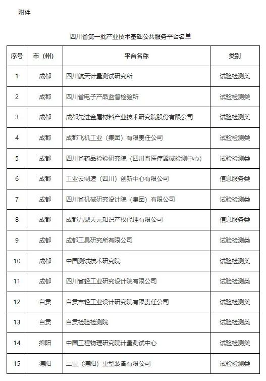为深入实施创新驱动发展战略,加速推进产业基础再造工程,持续完善产业技术基础公共服务体系,根据《四川省产业技术基础公共服务平台建设管理暂行办法》(川经信规〔2022〕8号)规定,经单位自主申报、市(州)审核推荐、专家评审、现场核验、公示等相关程序,认定四川航天计量测试研究所等15家单位为四川省第一批产业技术基础公共服务平台(见附件),并提出有关工作要求。