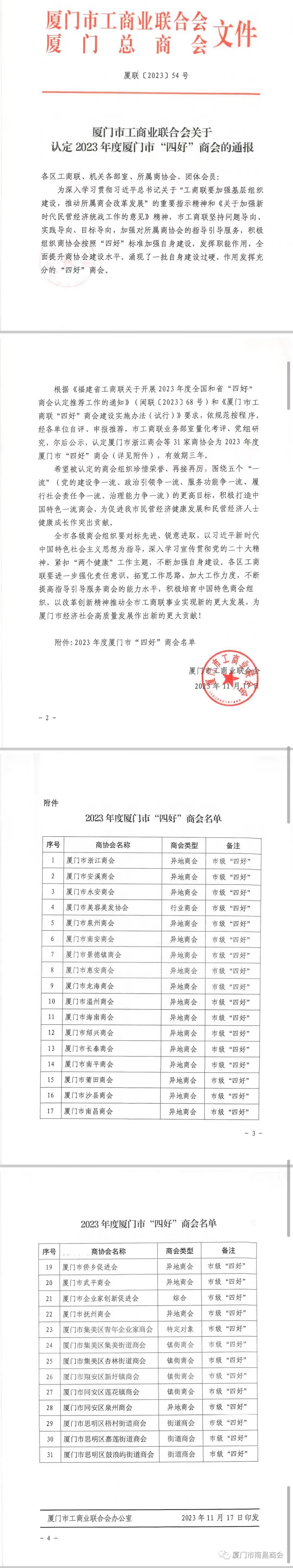 近日,厦门市工商联(总商会)发布《厦门市工商联(总商会)关于认定2023年度厦门市“四好”商会的通报》,我厦门市南昌商会再次评选为厦门市“四好”商会。