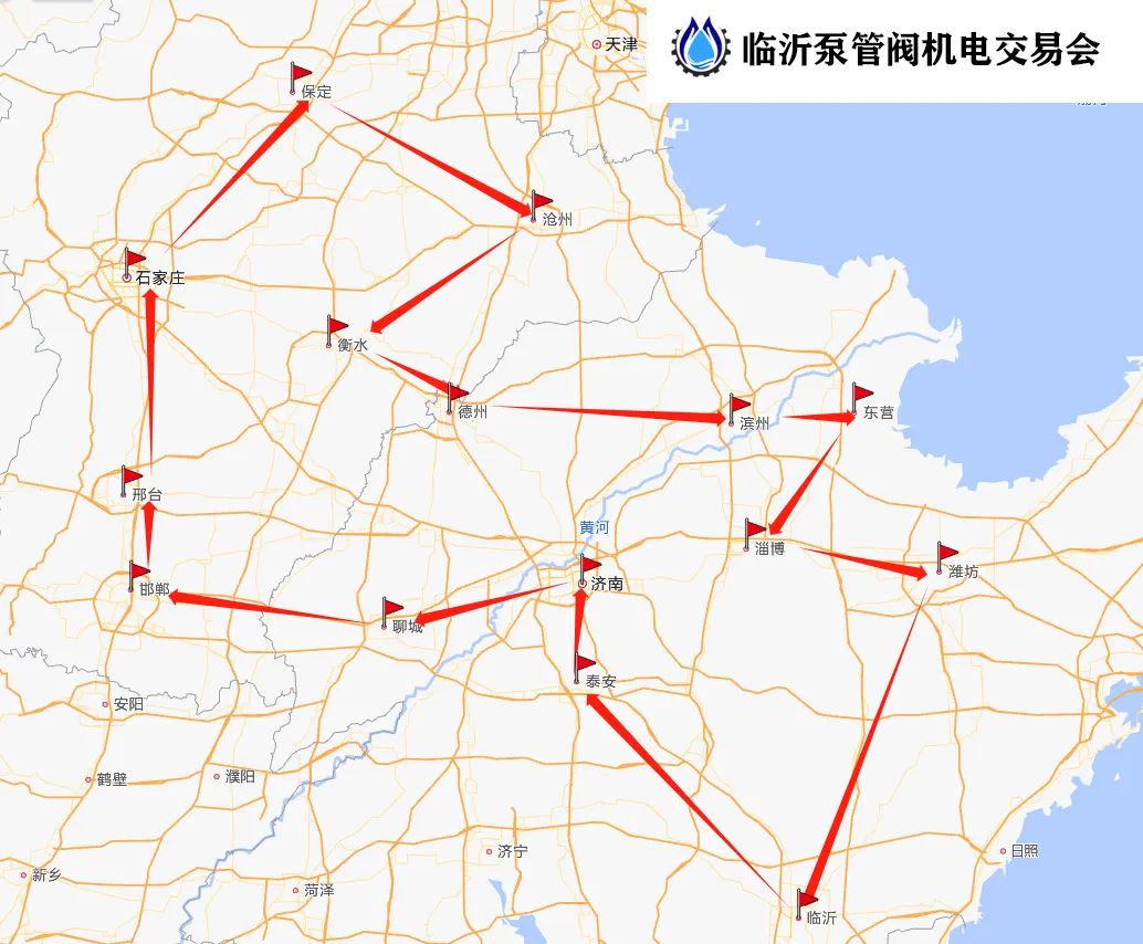 泰安→聊城→邯郸→邢台→石家庄→保定→沧州→衡水→德州→济南→滨州→东营→淄博→潍坊→临沂
