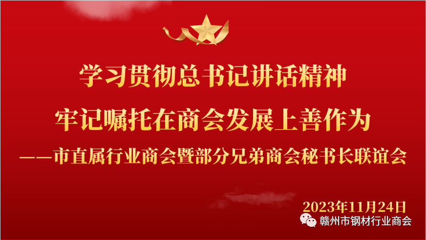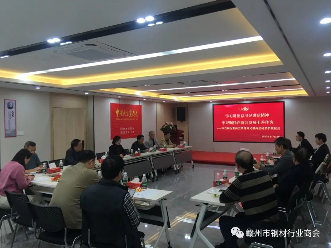 为进一步促进商会发展,增进兄弟商会的相互了解,加强商会间的沟通联系,增进友谊,共促发展。2023年11月24日下午,赣州市钢材行业商会在会长单位赣州人和实业集团有限公司23楼会议室举办“学习贯彻总书记讲话精神,牢记嘱托在商会发展上善作为”为主题的市直属行业商会暨部分兄弟商会秘书长联谊会。商会秘书长们齐聚一堂,一起走进赣州市钢材行业商会进行交流座谈。