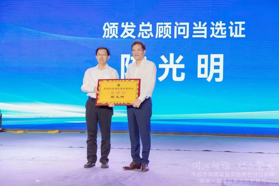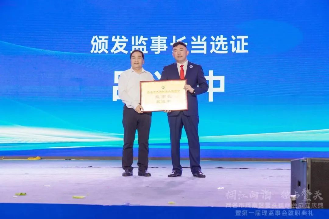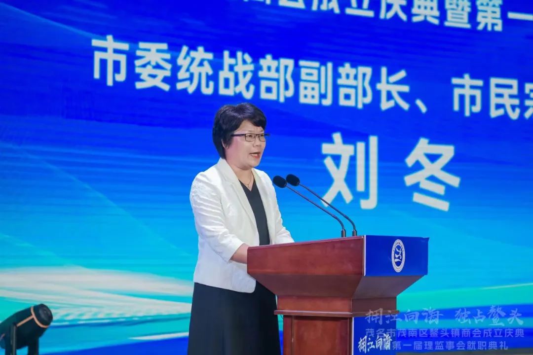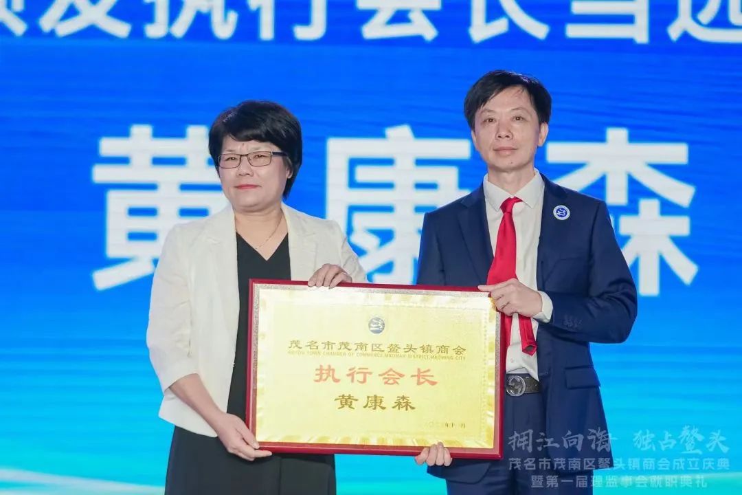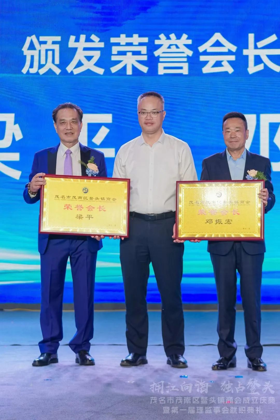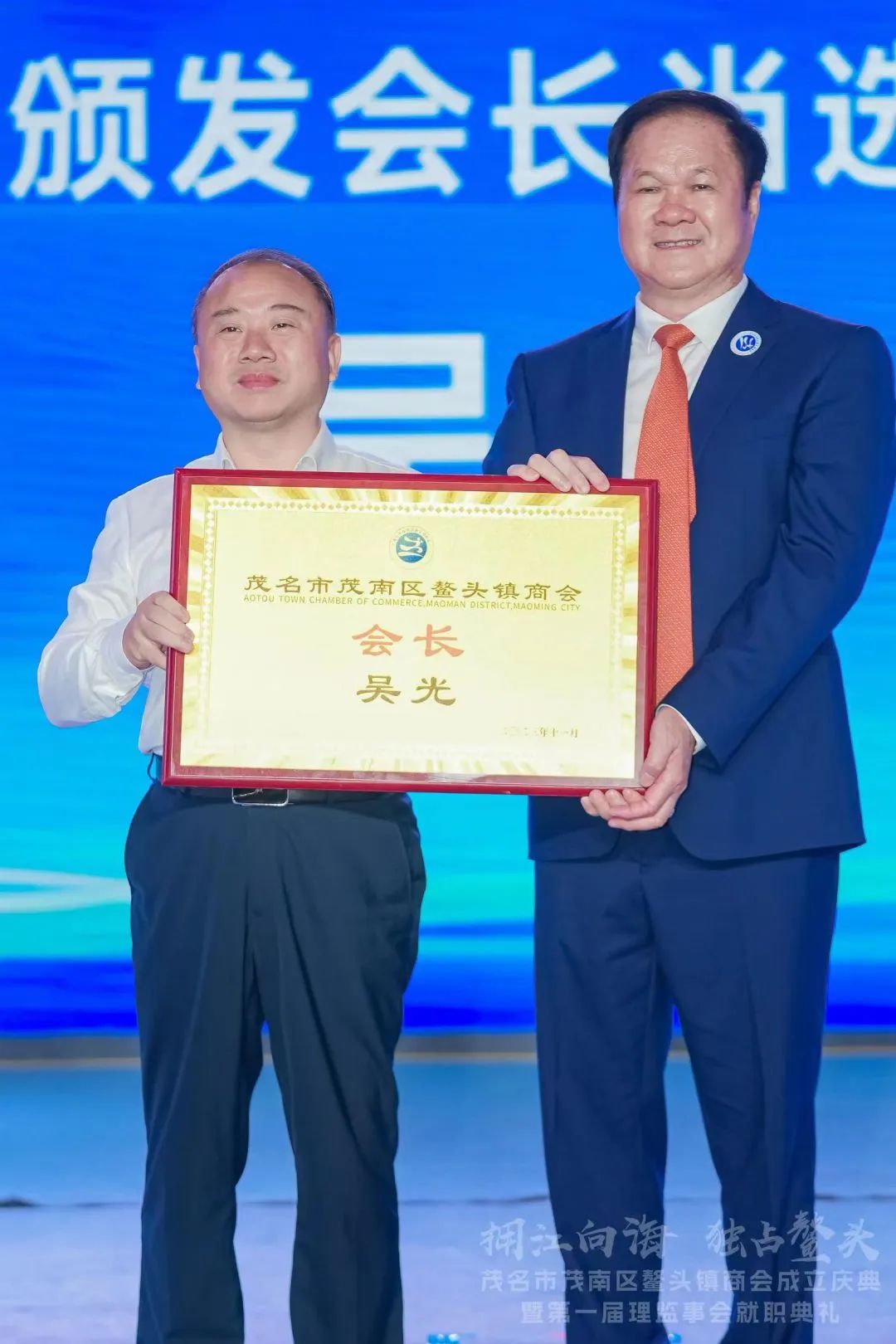为进一步凝聚发展合力,加强商会建设,赋能“百会帮百镇”行动,谱写鳌头镇“百千万工程”高质量发展新篇章,11月26日,茂名市茂南区鳌头镇商会第一届理监事会就职典礼在茂名市第四中学圆满举行。区委书记廖述毅,区委副书记、区长吕国记,市委统战部副部长、市民宗局局长刘冬,区人大常委会党组书记、主任杨志宇,区委副书记何龙江,区委常委、统战部部长李成波等相关领导,茂南区各商(协)会会长及相关人员等共2000余人出席活动。市政协秘书、市商务局党组书记杨润星为梁平、邓振宏颁发荣誉会长当选证书市委统战部副部长、市民宗局局长刘冬为黄康森颁发执行会长当选证书 ▲区委常委、统战部部长李成波作讲话