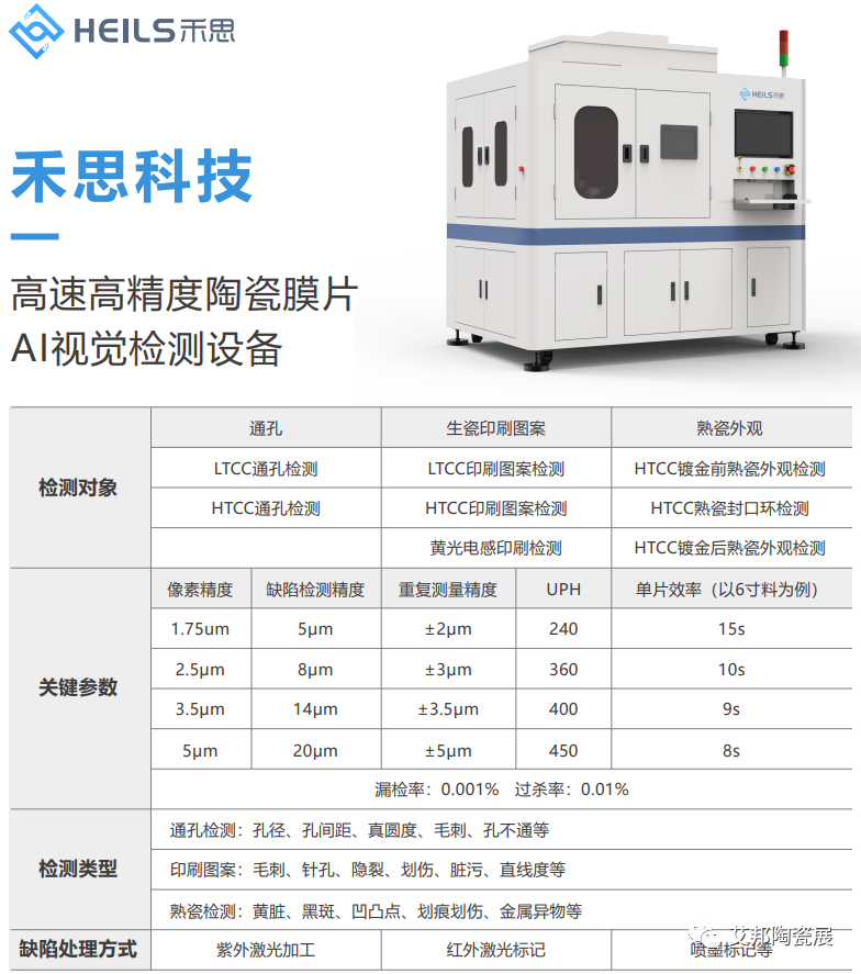 禾思拥有多年视觉行业丰富经验,基于自研视觉AI软件平台HeilsVison®,结合精密光学、AI算法、机电一体化等技术优势,面向精密陶瓷器件、电子陶瓷行业研发了一系列适用于LTCC、HTCC、黄光电感等产品的制程高精度全面检测设备,包含:通孔检测设备、印刷图案检测设备、黄光电感检测设备、熟瓷外观全检设备等;广泛应用于先进陶瓷行业多家龙头企业,为客户产品品质保驾护航。