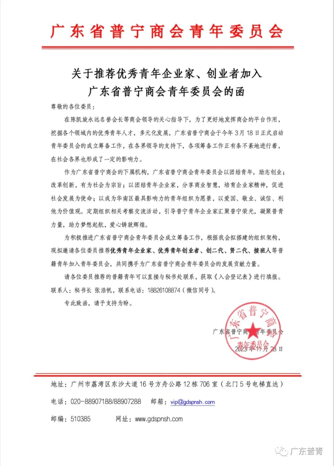 广东省普宁商会青年委员会是广东省普宁商会的下属机构。我会坚持政治引领,积极发挥桥梁纽带作用,引导青年企业家听党话、跟党走、促进政企沟通,不断提高青年企业家的政治地位。定期组织党政相关考察交流活动,引导普宁青年企业家坚持政治引领路线。汇聚普宁荣光,凝聚普青力量,助力梦想起航,爱心铸就辉煌。我会以团结青年,励志创业;改革创新,有为社会为宗旨;以团结青年企业家促进社会发展;以分享商业智慧,培育企业家精神,促进社会发展为使命;以爱国、敬业、诚信、利他为价值观,发展成为华南区最具影响力的青年组织。