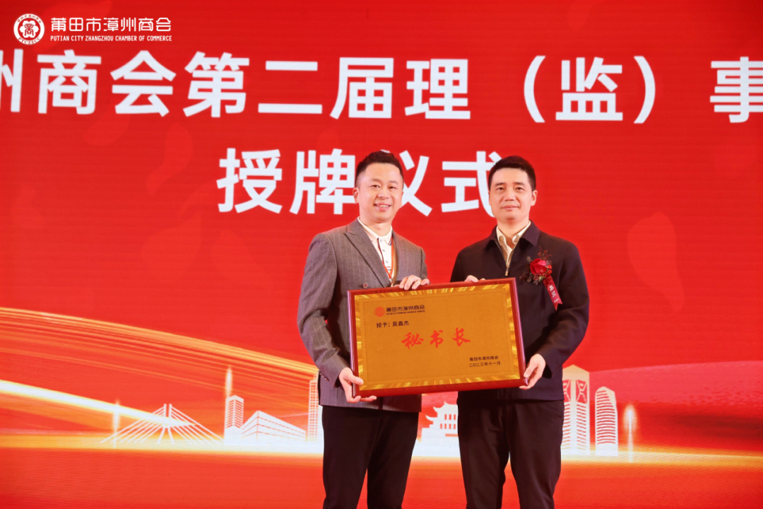 莆田市工商联党组成员、专职副主席胡建新为秘书长授牌。