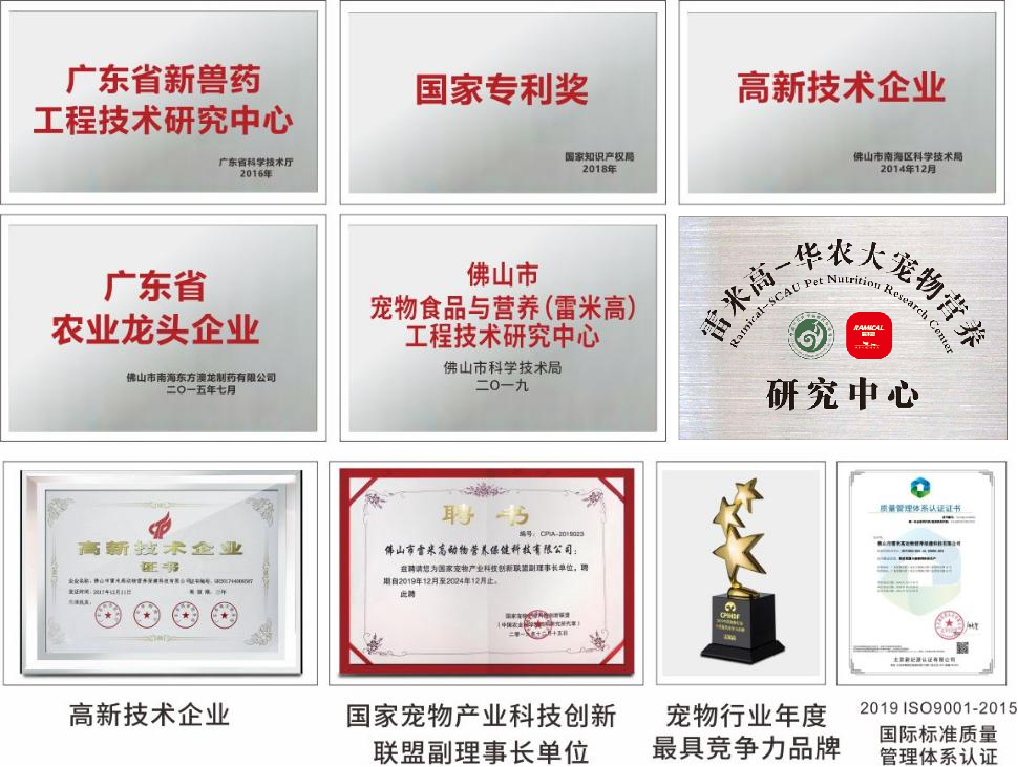 雷米高坚持创新驱动,不断为创新垒实基础研发设施,现已拥有"宠物药品生产研发基地”、“宠物粮食生产研发基地”、“犬猫科学试验中心”三大产研基地,拥有专业研发团队超50人,并与华南农业大学联合成立宠物营养研究中心。