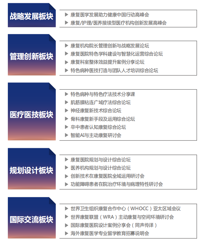 为顺应时代发展潮流,2023年,展会正式更名为“康复医院建设博览会”,并同时增设“康复医院建设与设计年会”为第三个平行大会。2024年的康复医院建设博览会开幕期间,将有更多国内外专业嘉宾及业内人士到场参会,身份涵盖康复“投资方,院长,规划师,设计师,工程师,科主任,医生,治疗师,护士,患者,患者家属”等群体,相关论坛总计达数十场。