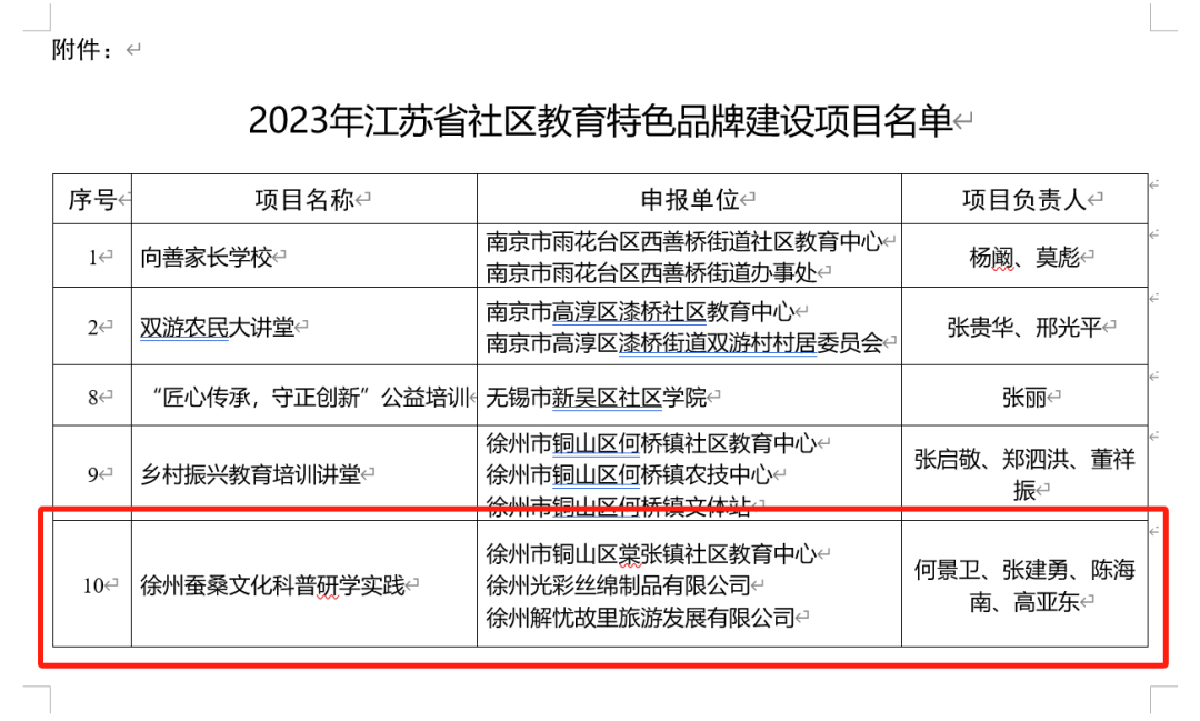 江苏省教育厅在10月8日发布公告,棠张镇社区教育中心与蚕桑文化馆以及解忧蚕桑文化生态园合作项目《徐州蚕桑文化科普研学实践》成功入选“2023年省级社区教育特色品牌建设项目”