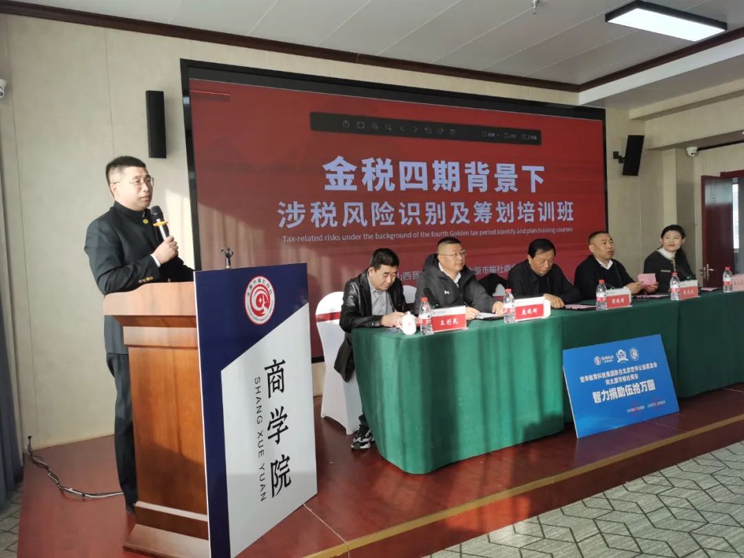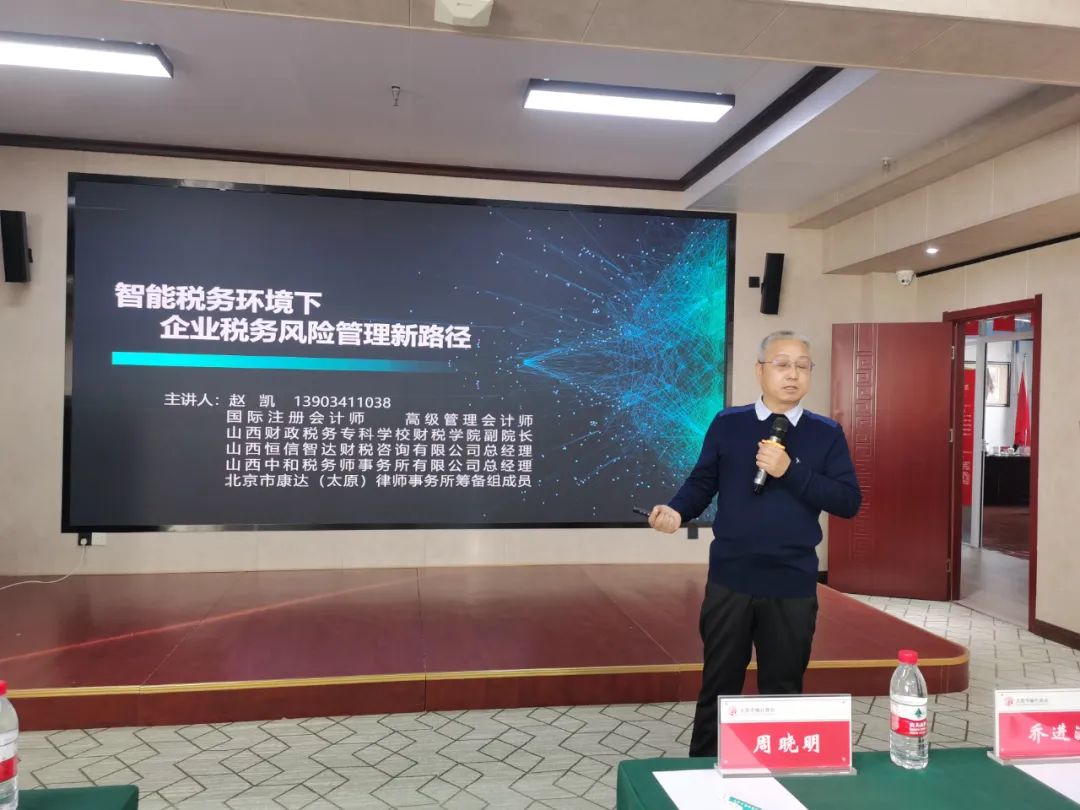 山西省财税专科学校财税学院副院长、山西省公共绩效评价协会常务理事、山西恒信智达财税咨询有限公司总经理、山西徳欣税务师事务所有限公司总经理赵凯教授作了《金税四期背景下涉税风险识别及筹划》专题培训报告,对“金税四期”税务风险管控背景分析、企业资本运营涉税风险管控与筹划、重组涉税风险管控与筹划等内容进行了讲解。报告聚焦目前的经济形势,从多角度、多维度对企业未来的发展之路进行了深入浅出的分析,助力企业沿着高质量发展航道破浪前行,向着更加光明的未来行稳致远。赵教授讲授激情澎湃,赢得培训学员的阵阵掌声,培训取得了满意的效果。