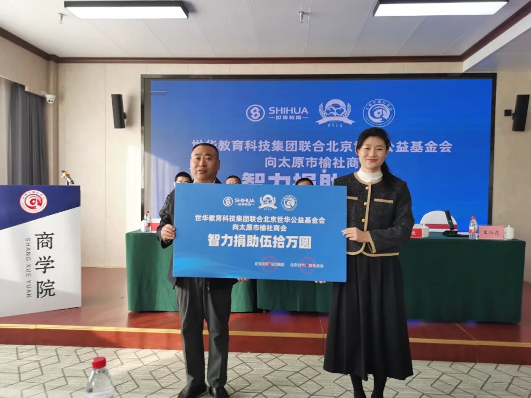 会上,王沁花经理代表世华教育集团、北京世华公益基金会向太原市榆社商会智力捐助50万元培训经费。